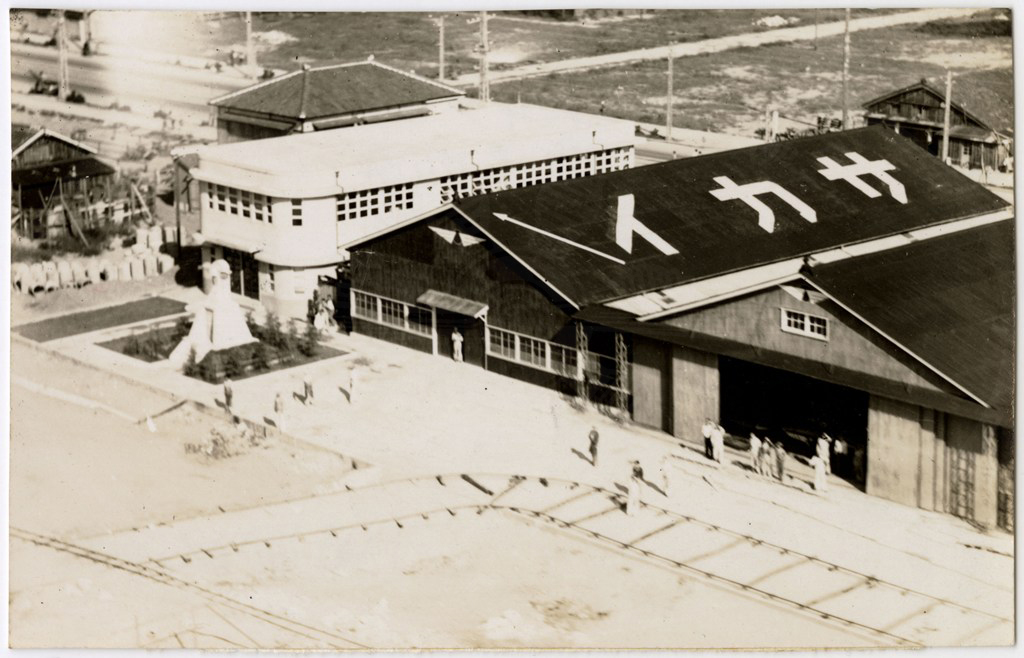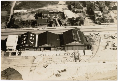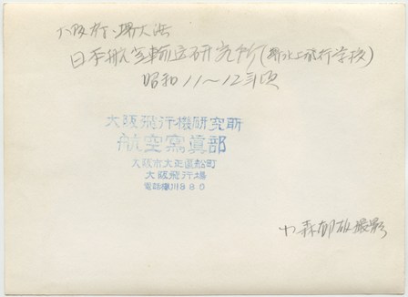 | 格納庫の屋根に「サカイ」、「日本航空輸送研究所」と書かれている。現在は堺市消防局となっている。 |