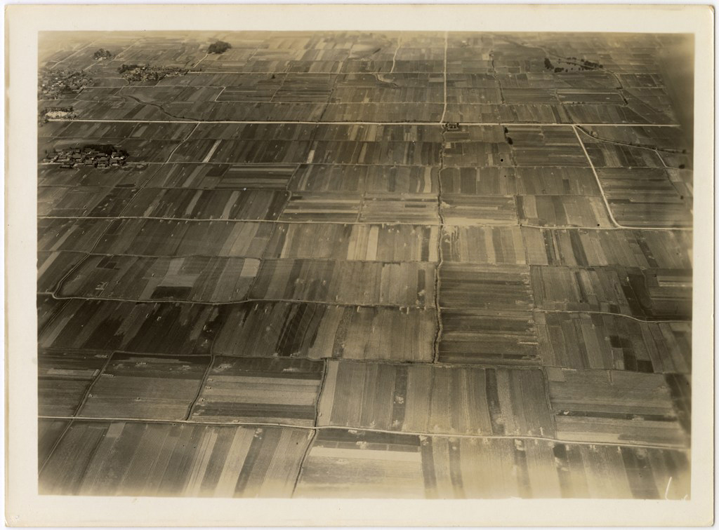 大阪第二国際飛行場予定敷地空中写真 (4) 南方から北方に向って撮影 上方の左右への直線道路は伊丹町側(左方)から大阪府豊中町(右方)に通ずる道路 昭和10〜11年頃 小森郁雄撮 |