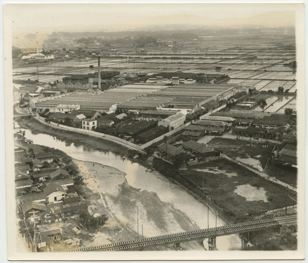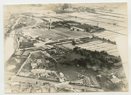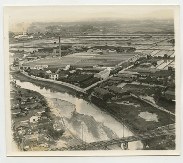 工場西側(写真下側)の線路は南海鉄道阪堺線(現在の阪堺電気軌道(株)阪堺線)