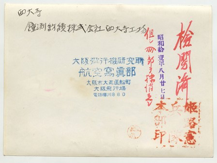 | 西大寺 鐘渕紡績株式会社西大寺工場 検閲済 昭和拾壹年八月廿七日 但シ 部ヲ抹消スヘシ 姫路憲兵隊本部印 |