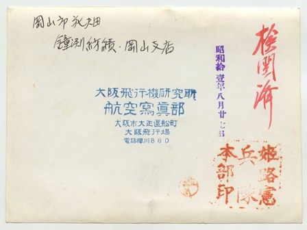 岡山市花畑 鐘渕紡績、岡山支店 検閲済 昭和拾壹年八月廿七日 姫路憲兵隊本部印 |