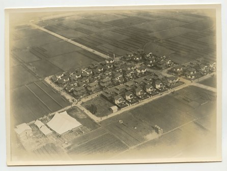 | 集落を南北に貫通する通りは現在の大阪府道2号線。写真左下には周囲に紅白幕の張られた大きなテントが設置されている。昭和11年11月15日の式典の際の写真と思われる |