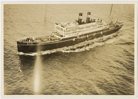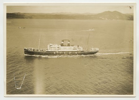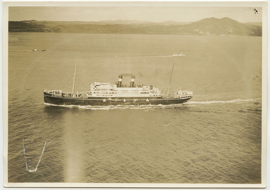 蓬莱丸は大阪商船の所属。小森郁雄は『航空情報』189号で「大阪商船から頼まれて新造船の空中撮影も数回やり、大きなビラや宣伝パンフレットに使われたりした」と回想している。
