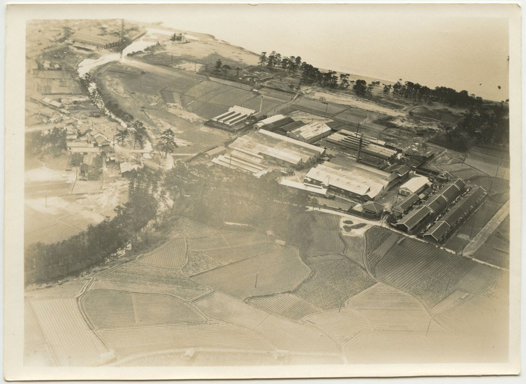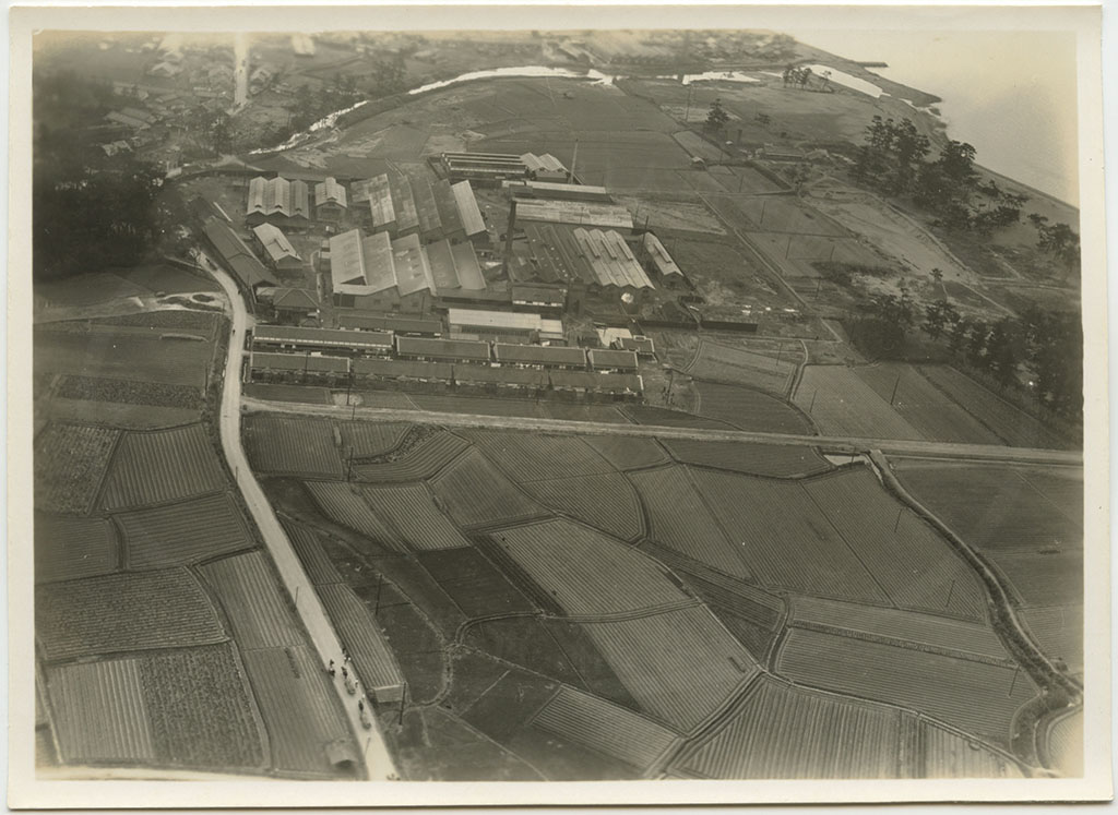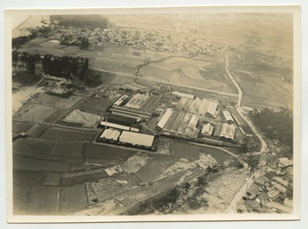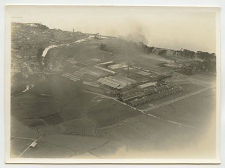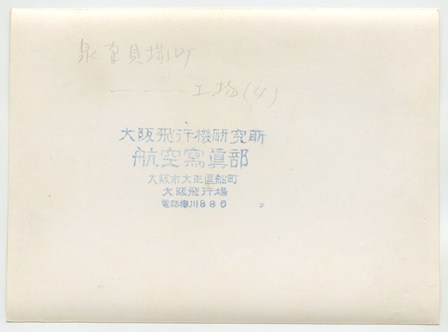 | 写真左上に大阪湾が見えている。工場名は未詳。工場跡地は現在は「いこらも〜る泉佐野」となっている。 裏書きにある「FOX MOTH」は飛行機の機種名デハビランドDH.83フォックスモス、「張氏」は大阪飛行機研究所のパイロット張徳昌のこと |