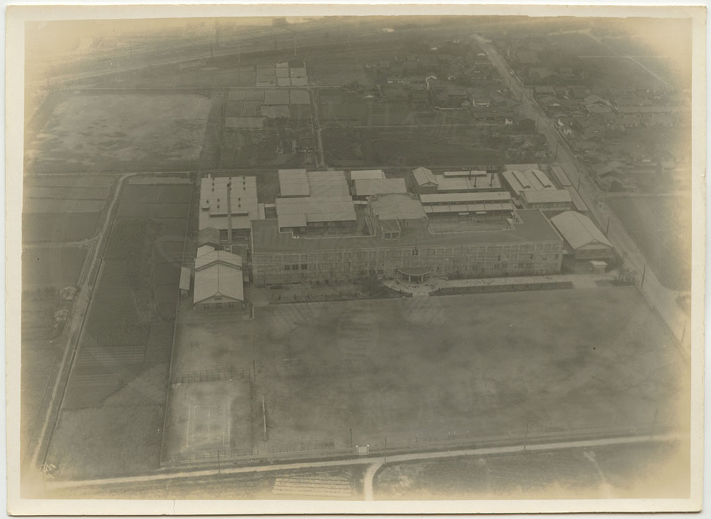 裏書きに「第一工芸学校(?)」とあるが、正しくは京都市立第一工業学校(現在の京都市立京都工学院高等学校の前身)。現在はこの場所に京都市立開建高等学校がある。学校の北側(写真上側)に西大路駅が見えている