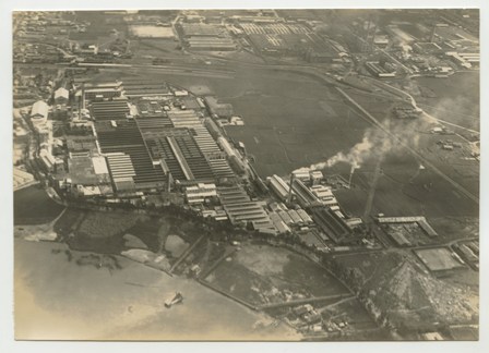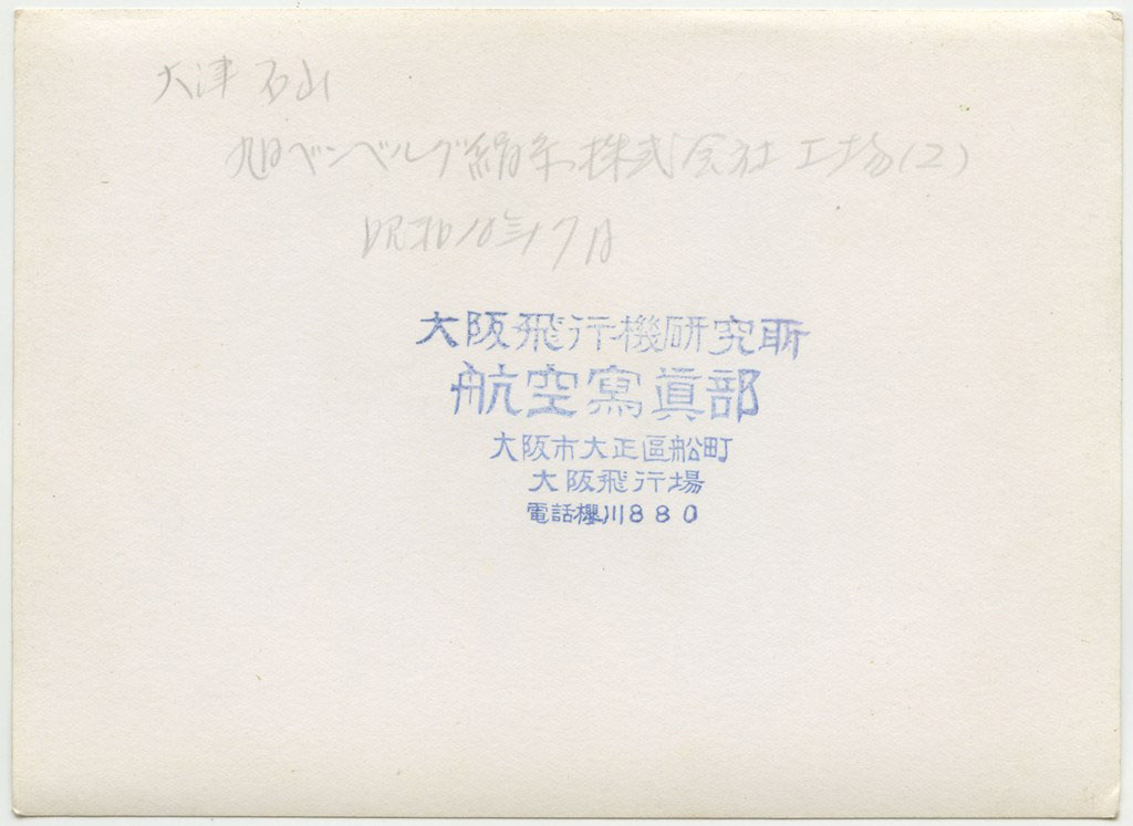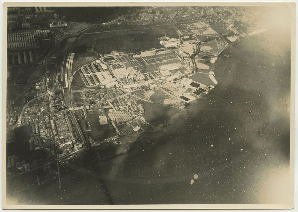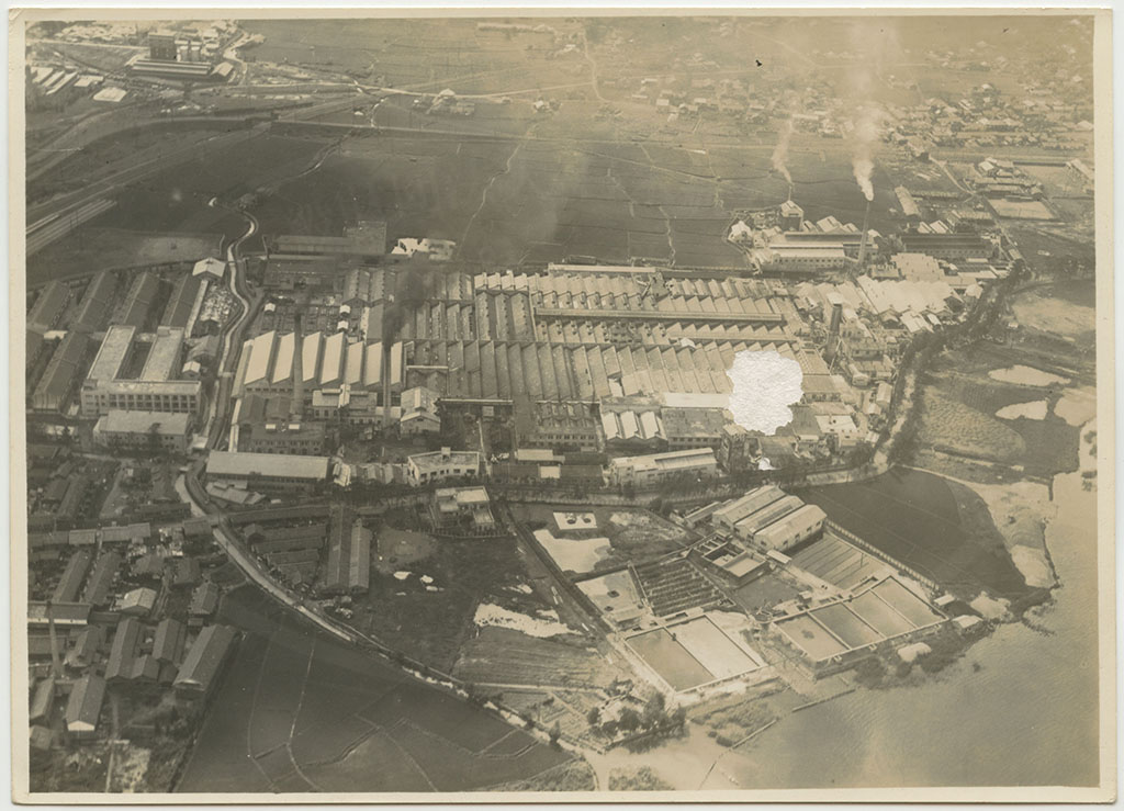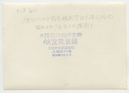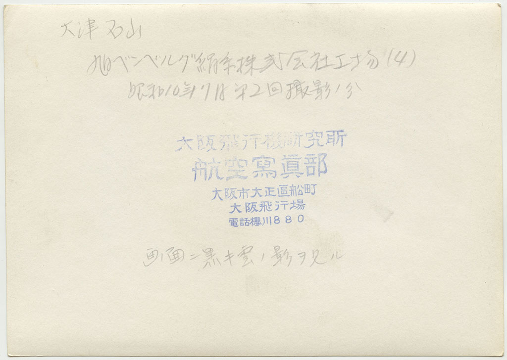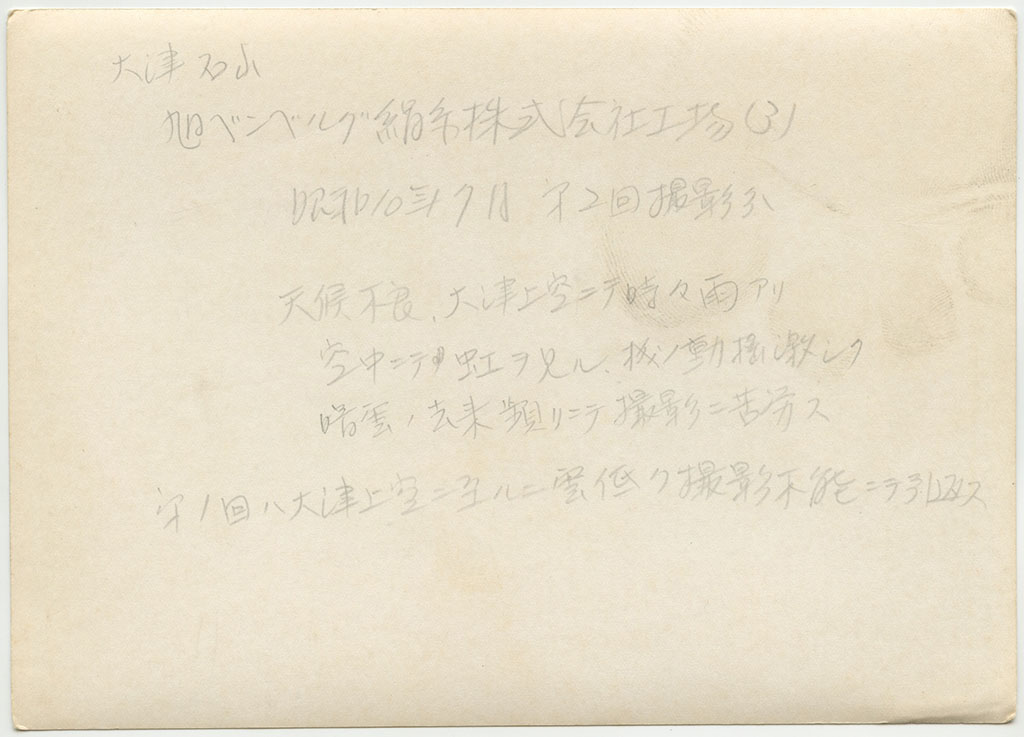 | 大津石山 旭ベンベルグ絹糸株式会社工場(3) 昭和10年7月 第2回撮影分 天候不良、大津上空ニテ時々雨アリ 空中ニテ虹ヲ見ル 機ノ動揺激シク 暗雲ノ去来頻リニテ撮影ニ苦労ス 第1回ハ大津上空ニ至ルニ雲低ク撮影不能ニテ引返ス |