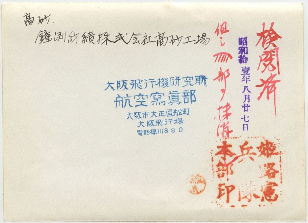 | 高砂 鐘渕紡績株式会社高砂工場 検閲済 昭和拾壹年八月廿七日 但シ 部ヲ抹消スヘシ 姫路憲兵隊本部印 |