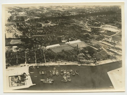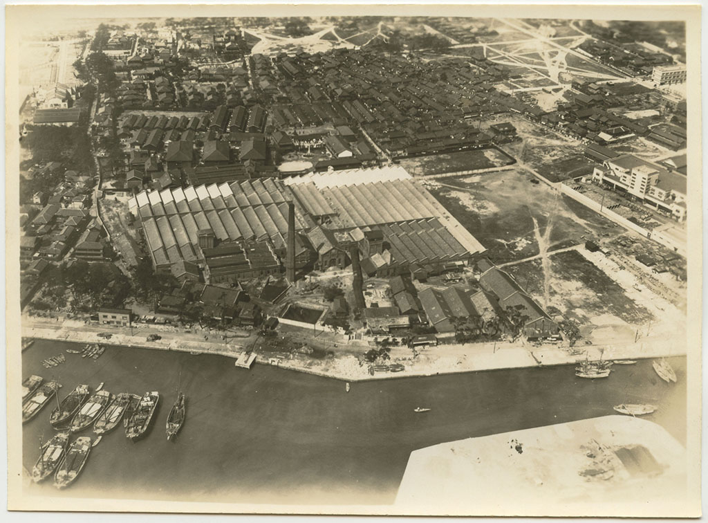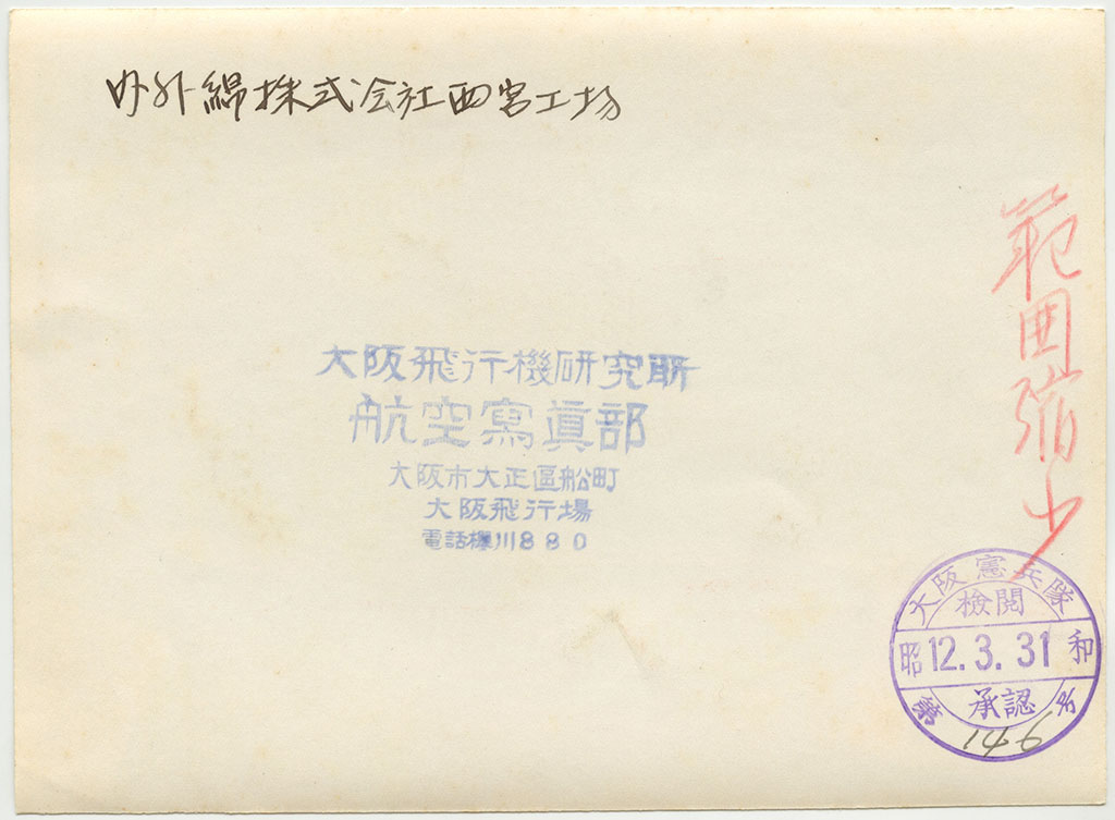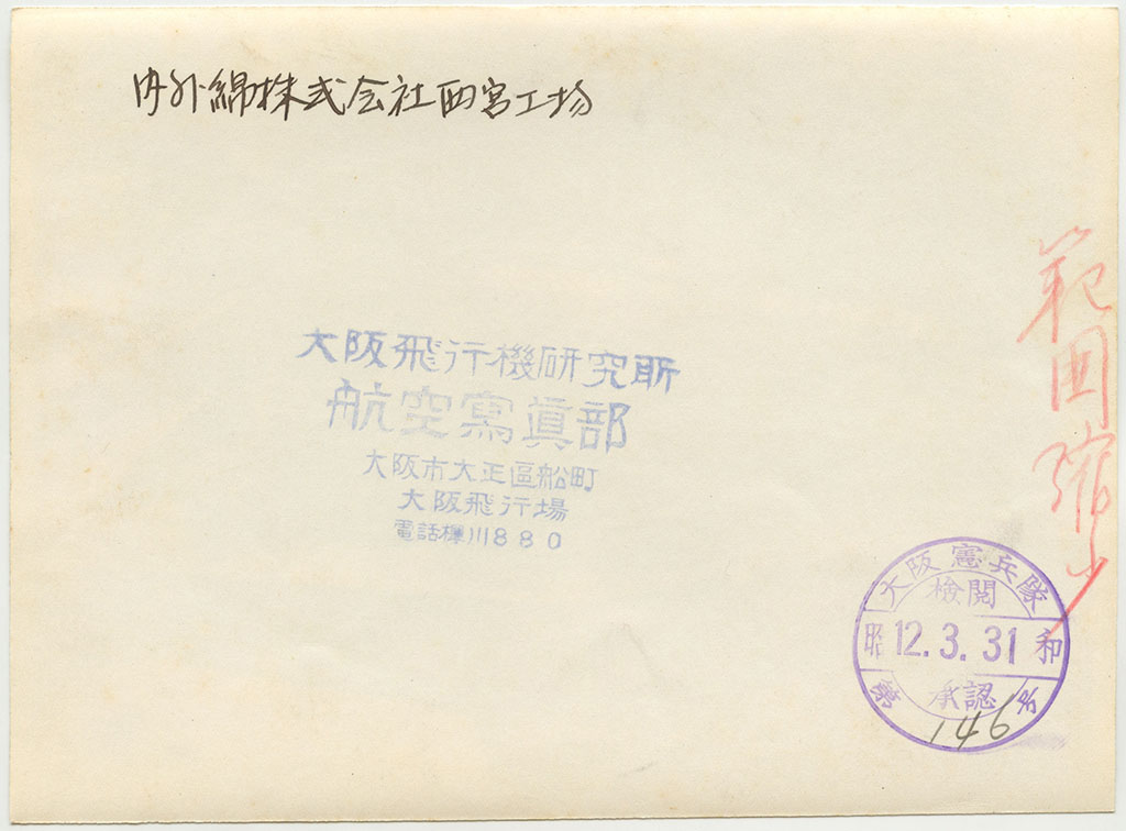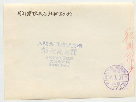 上の写真の裏書きの憲兵の「範囲縮小」という指示通りにトリミングがなされ、写真の上に『飛行機より見たる西宮工場/内外綿株式會社』という文字がインポーズされて完成している。