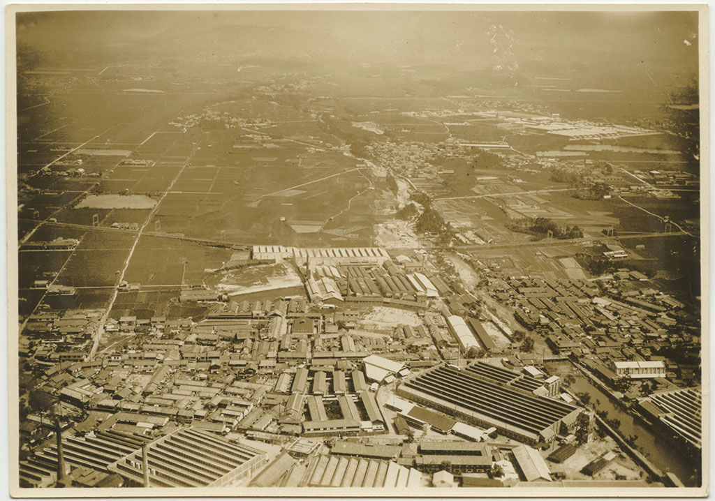 | 工場南(写真右側)を流れるのは津田川で、その上流左岸に大日本紡績貝塚工場がみえる。 |