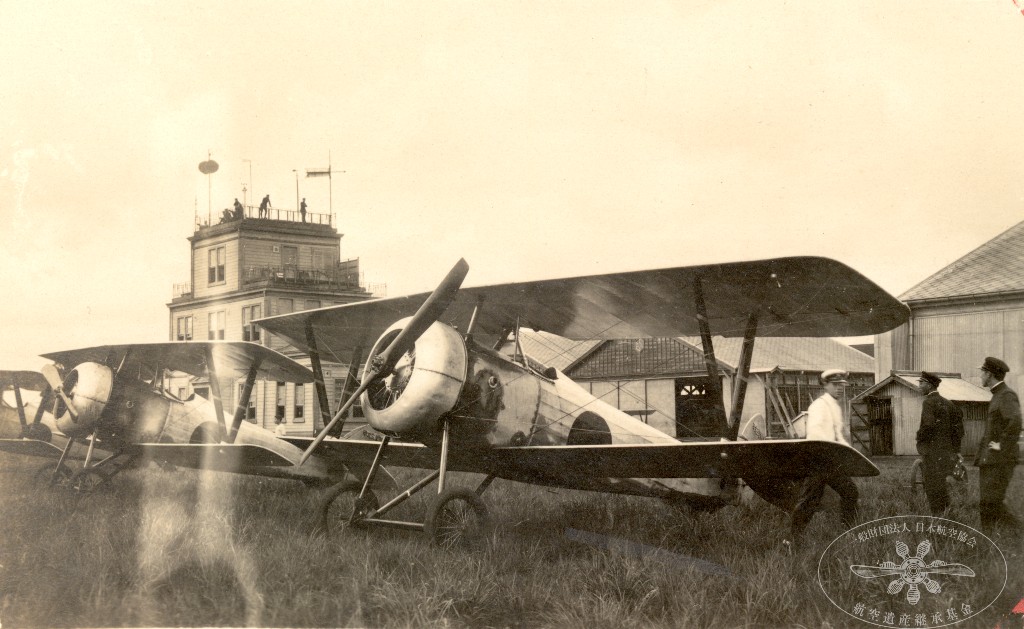 写真:陸軍の甲式三型(ニューポール24)。背景に特徴的な気象観測所が写っており、所沢飛行場(東京)での撮影と分かります。 |