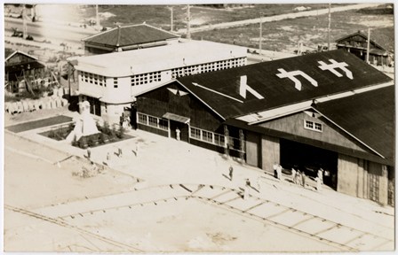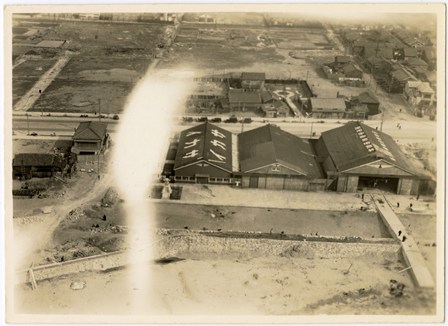 | 格納庫の屋根に「サカイ」、「日本航空輸送研究所」と書かれている。現在は堺市消防局となっている。 |
