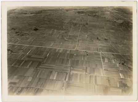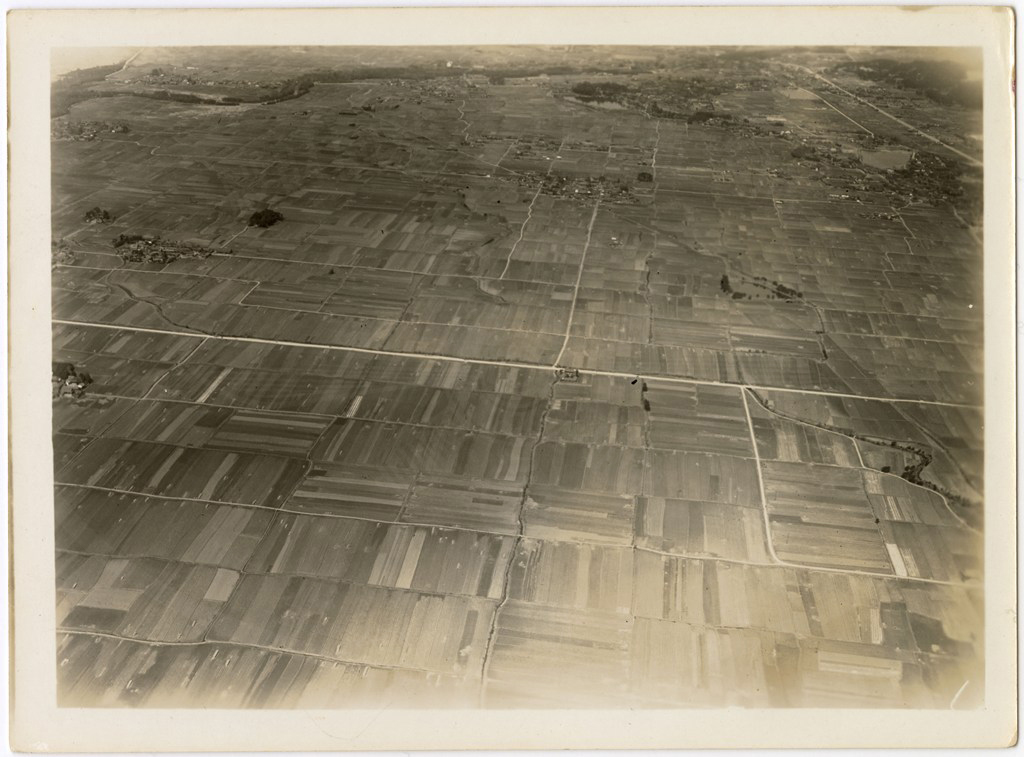 大阪第二国際飛行場予定敷地空中写真 (4) 南方から北方に向って撮影 上方の左右への直線道路は伊丹町側(左方)から大阪府豊中町(右方)に通ずる道路 昭和10〜11年頃 小森郁雄撮 |