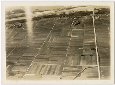 大阪第二国際飛行場予定地空中写真 (3) 右側の上下に通ずる道路は下方(大阪府豊中町)から上方(伊丹町)に通ずる道路 当時はこの道路から南方(左側)の方が飛行場として向いていると思われた 昭和10〜11年頃 大阪飛行機研究所 小森郁雄撮 |