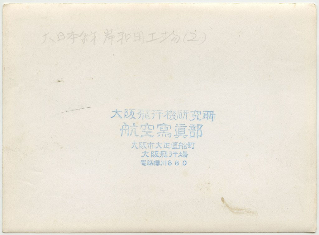 裏書きに「大日本紡績岸和田工場」とあるが、正しくは大日本紡績貝塚工場。現在は日本生命貝塚グラウンドや商業施設、貝塚市歴史博物館となっている。工場手前の阪和線の線路があり、左端には東貝塚駅が見えている