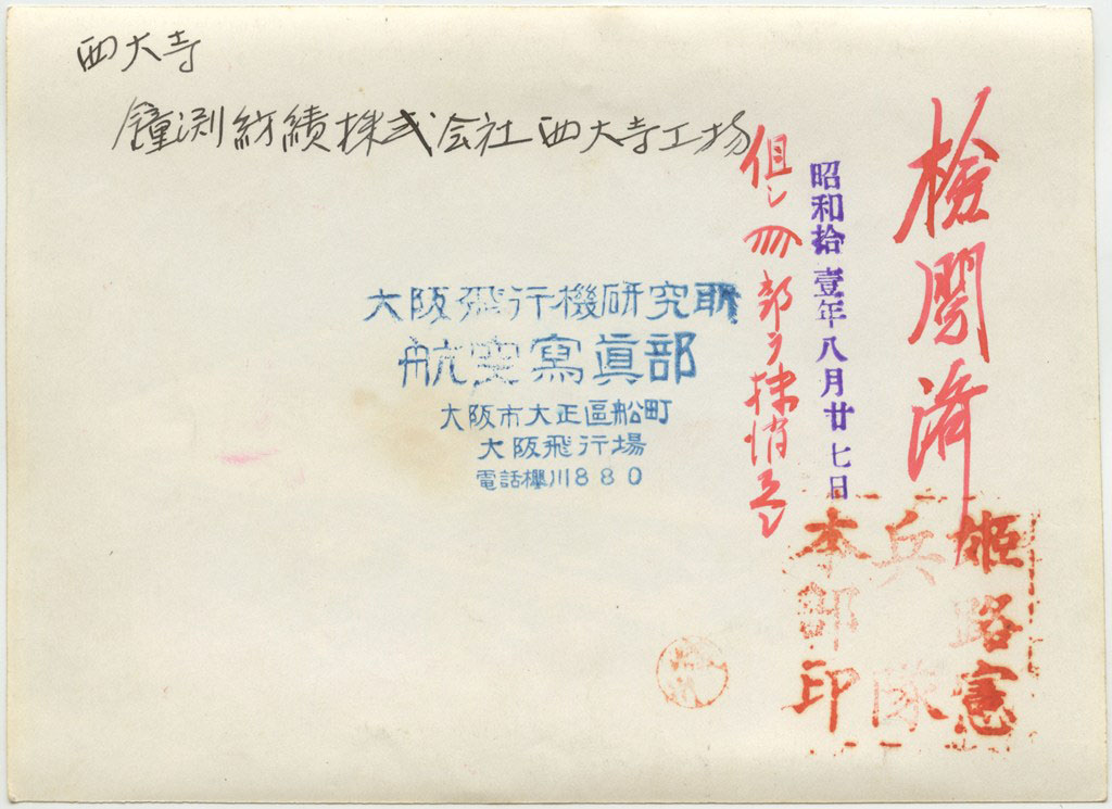 | 西大寺 鐘渕紡績株式会社西大寺工場 検閲済 昭和拾壹年八月廿七日 但シ 部ヲ抹消スヘシ 姫路憲兵隊本部印 |