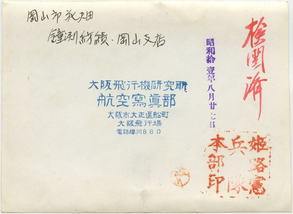 岡山市花畑 鐘渕紡績、岡山支店 検閲済 昭和拾壹年八月廿七日 姫路憲兵隊本部印 |
