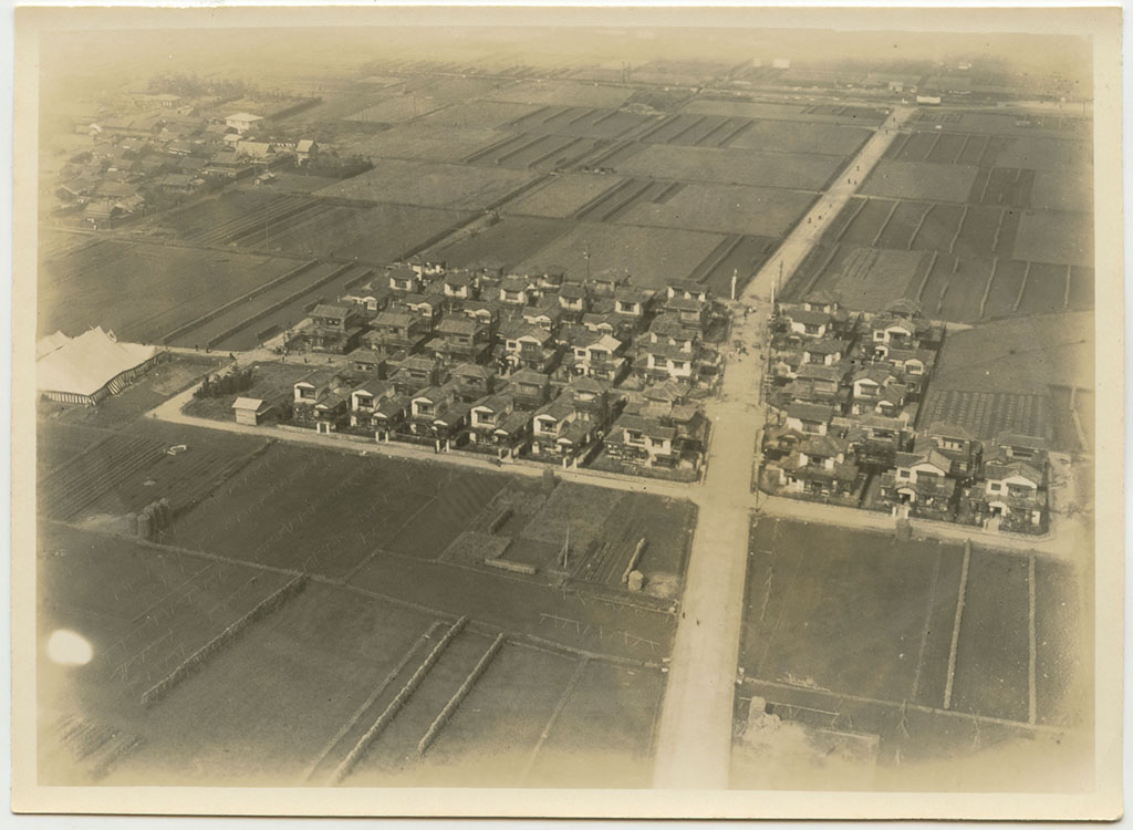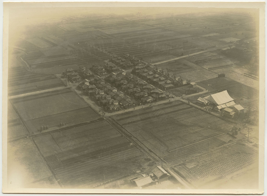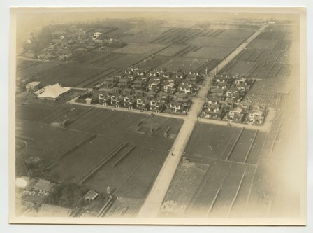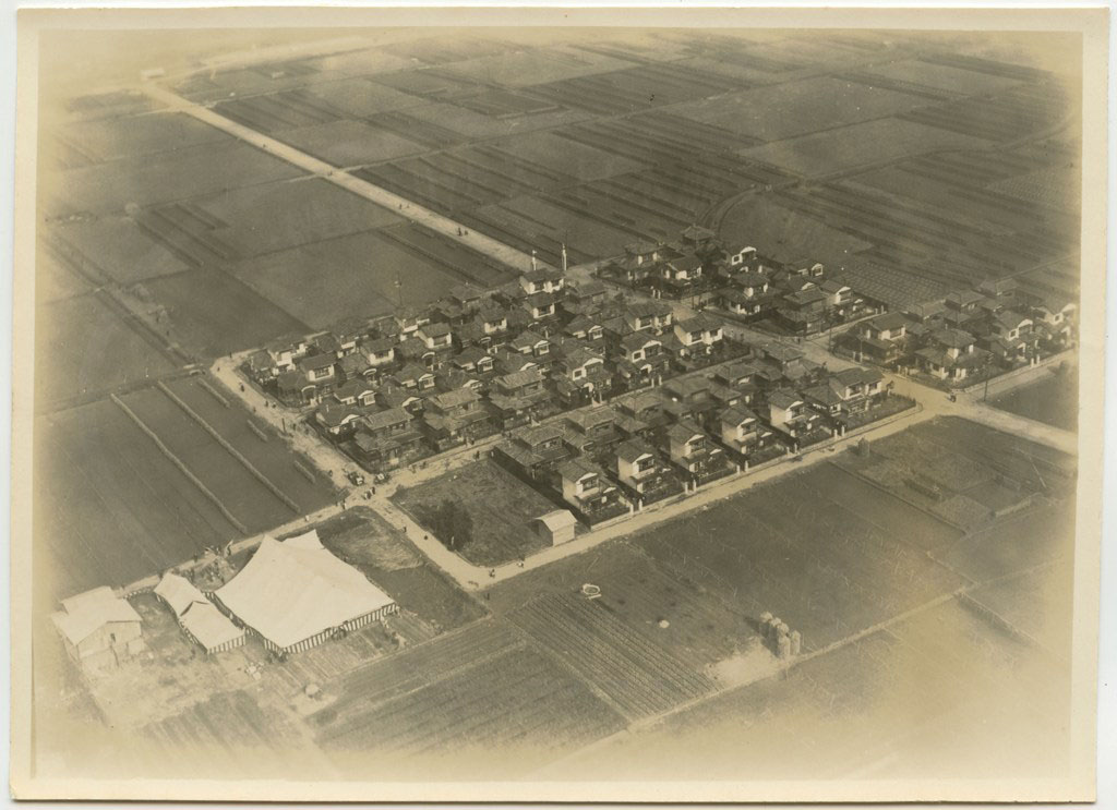 | 集落を南北に貫通する通りは現在の大阪府道2号線。写真左下には周囲に紅白幕の張られた大きなテントが設置されている。昭和11年11月15日の式典の際の写真と思われる |