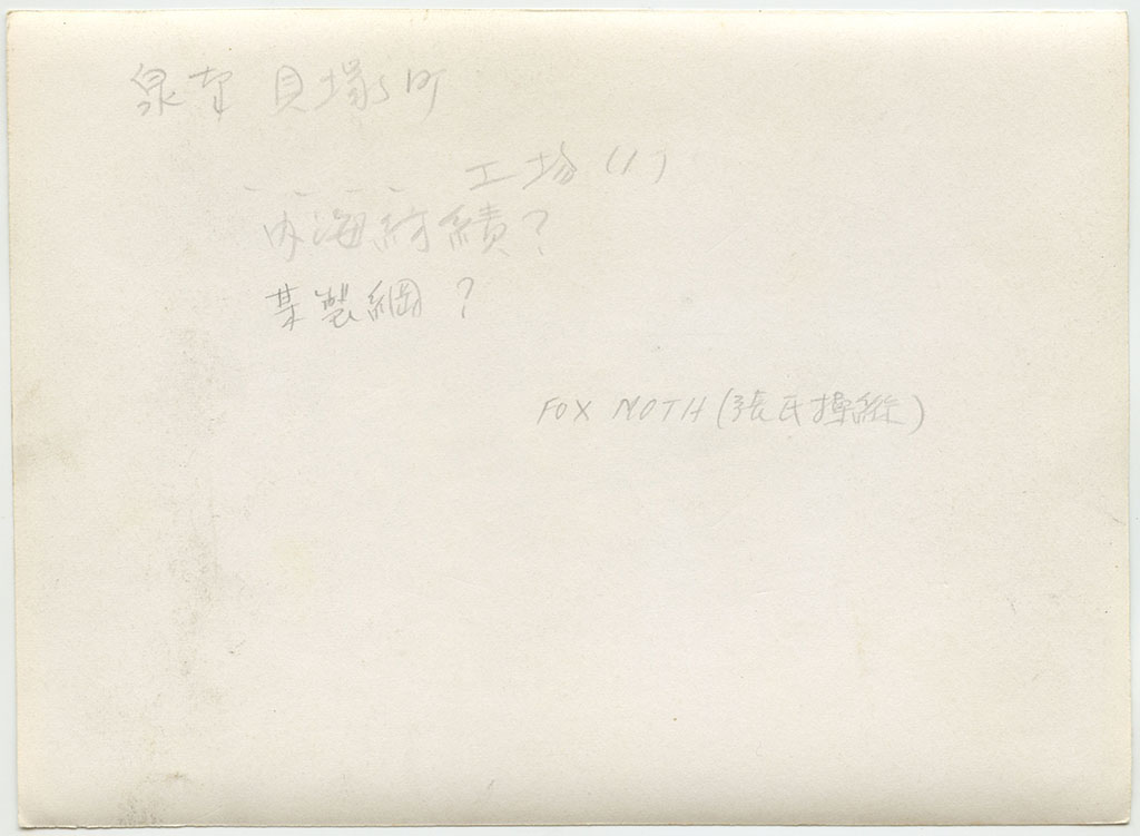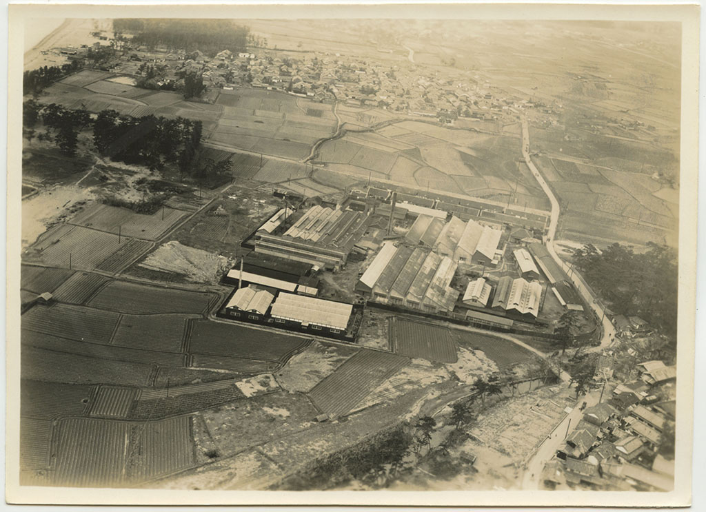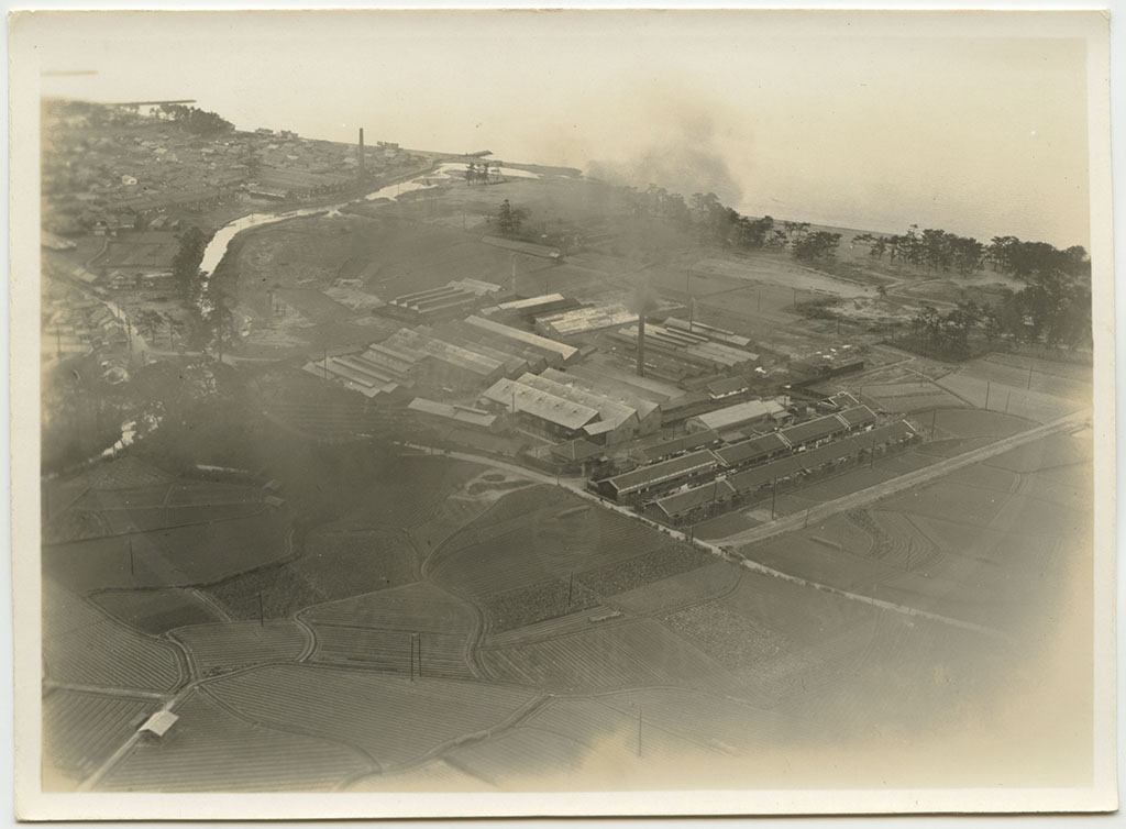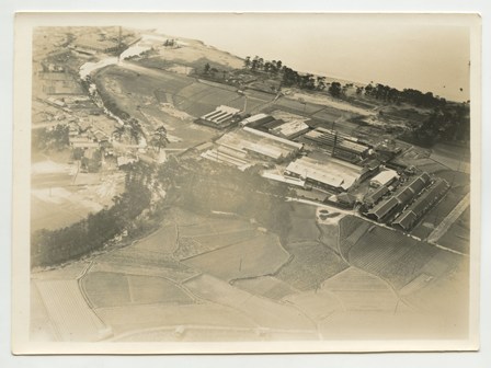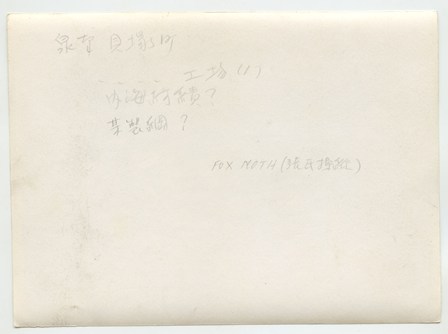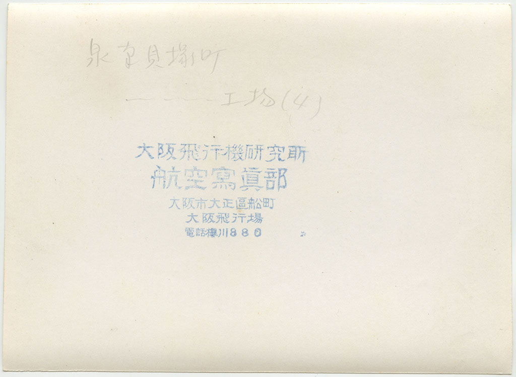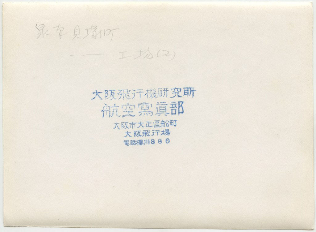 | 写真左上に大阪湾が見えている。工場名は未詳。工場跡地は現在は「いこらも〜る泉佐野」となっている。 裏書きにある「FOX MOTH」は飛行機の機種名デハビランドDH.83フォックスモス、「張氏」は大阪飛行機研究所のパイロット張徳昌のこと |