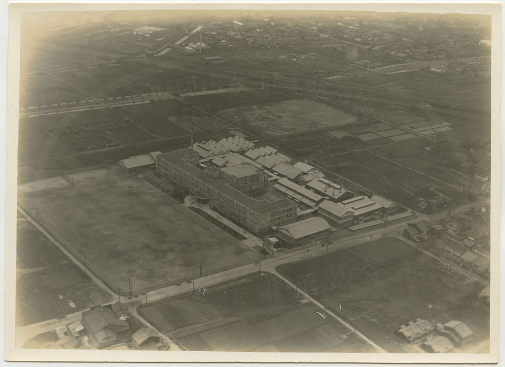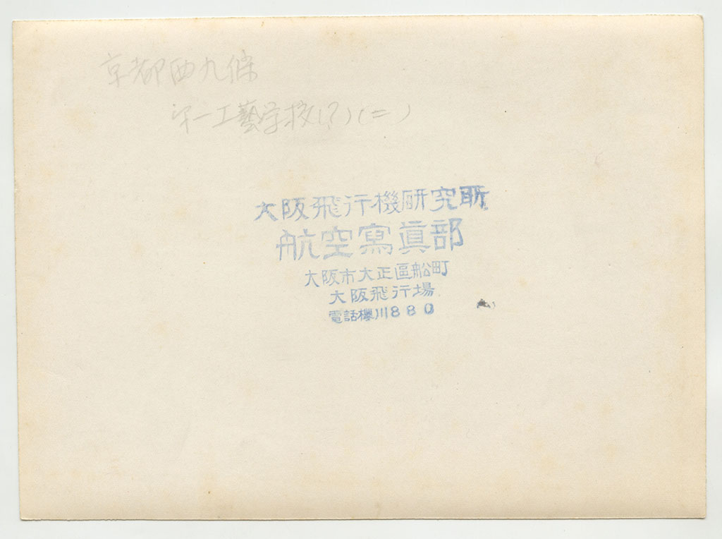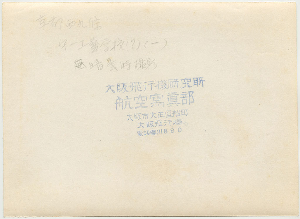 裏書きに「第一工芸学校(?)」とあるが、正しくは京都市立第一工業学校(現在の京都市立京都工学院高等学校の前身)。現在はこの場所に京都市立開建高等学校がある。学校の北側(写真上側)に西大路駅が見えている