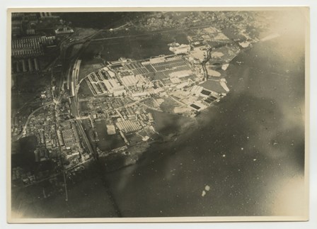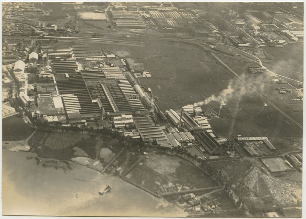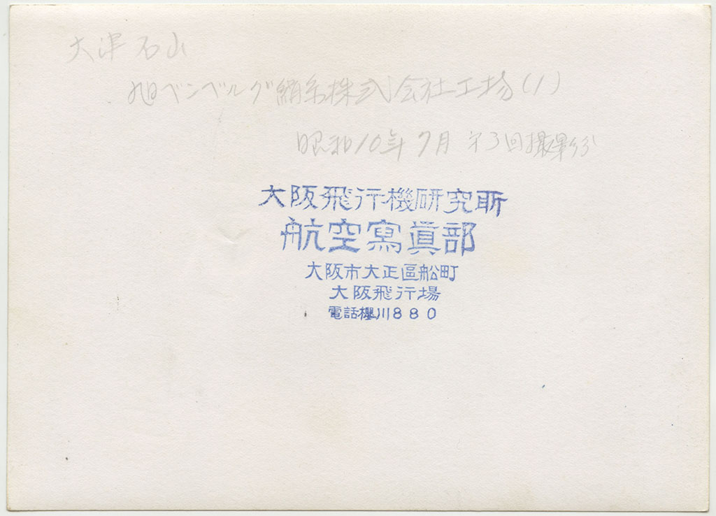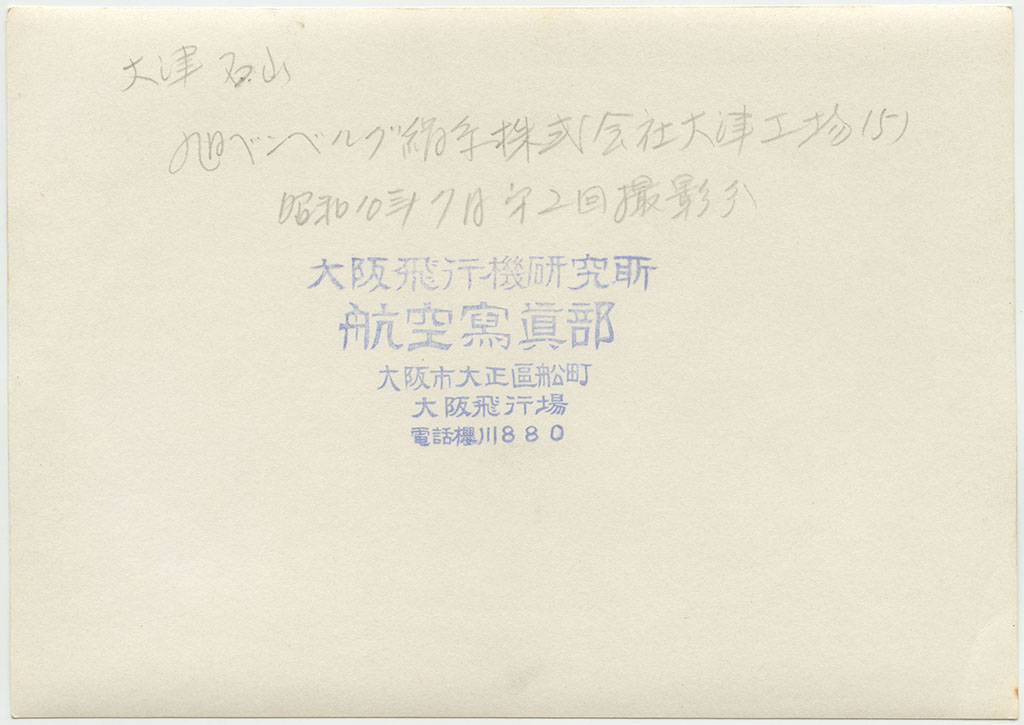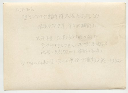 | 大津石山 旭ベンベルグ絹糸株式会社工場(3) 昭和10年7月 第2回撮影分 天候不良、大津上空ニテ時々雨アリ 空中ニテ虹ヲ見ル 機ノ動揺激シク 暗雲ノ去来頻リニテ撮影ニ苦労ス 第1回ハ大津上空ニ至ルニ雲低ク撮影不能ニテ引返ス |