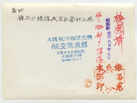 | 高砂 鐘渕紡績株式会社高砂工場 検閲済 昭和拾壹年八月廿七日 但シ 部ヲ抹消スヘシ 姫路憲兵隊本部印 |