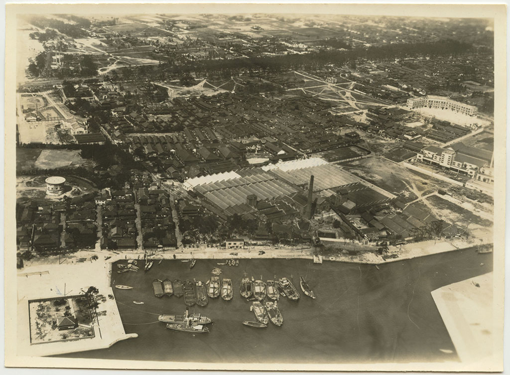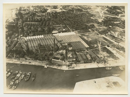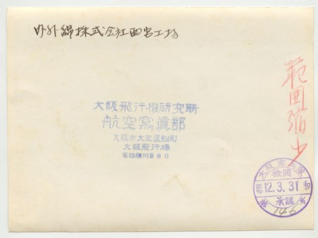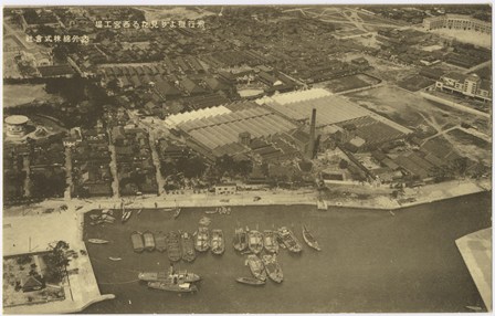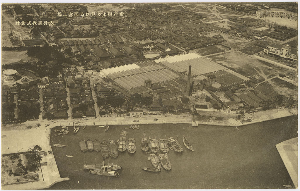 上の写真の裏書きの憲兵の「範囲縮小」という指示通りにトリミングがなされ、写真の上に『飛行機より見たる西宮工場/内外綿株式會社』という文字がインポーズされて完成している。