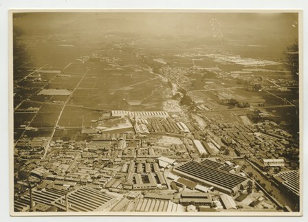 | 工場南(写真右側)を流れるのは津田川で、その上流左岸に大日本紡績貝塚工場がみえる。 |