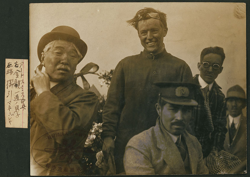 1/316枚目 画像ファイル名:SA-001_cover_02-01.jpg 【オリジナルキャプション】 アートスミス中央 右金親一直ノ息子 左端櫛引マネージャー アート・スミス(Art Smith)飛行士と櫛引弓人(くしびきゆみと)マネージャー。 1916(大正5)年4月に東京 青山外苑で飛行した時の一枚。オリジナルキャプションにある「金親一直ノ息子」は、浅草の料亭「一直」の主人金親の息子を指していると思われる。 参考 国民飛行会編輯部,1916,『飛行機の持ち来りたる日米の親善』、国民飛行会、国立国会図書館デジタルコレクション https://dl.ndl.go.jp/pid/942696 :p.13 |