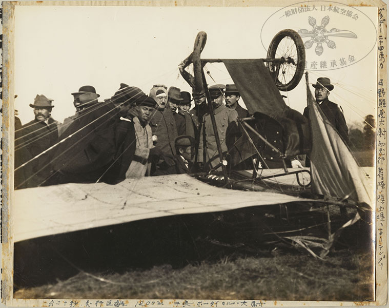 289/316枚目 画像ファイル名:SA-001_extra-01-01.jpg 【オリジナルキャプション】 (右)グラーデ二十四馬力 日野熊蔵大尉初飛行 着陸の際土堤ニ当リテンプク (下)一分二十秒飛行距離1200m 中央ホータイセルハ大尉 (航空協会注:「ホータイ」とあるがこれは頭巾である) 日野熊蔵のハンス・グラーデ1910(明治43)年単葉機。1910(明治43)年12月15日、東京 代々木。 写真中央の白い頭巾が操縦者の日野熊蔵大尉で、写真は12月15日の飛行時、着陸に失敗した際の様子。 参考 苅田重賀,2024,「1910年12月の日野、徳川両大尉の初飛行をめぐる考察」第304回日本航空協会講演会 苅田重賀,2024,「1910年の代々木での初飛行をめぐる考察」『航空と文化』日本航空協会,128号:p.21-31 渋谷敦,2006,『日野熊蔵伝 改訂版―日本初のパイロット』,たまきな出版舎(航空図書館所蔵):p.141 日本航空協会,1956,『日本航空史 明治・大正編』航空遺産継承基金アーカイブ:p.33 |