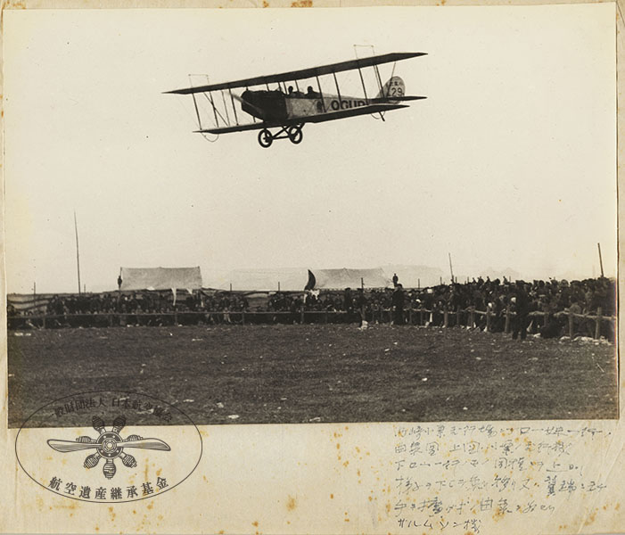 312/316枚目 画像ファイル名:SA-001_extra-21-01.jpg 【オリジナルキャプション】 洲崎小栗飛行場ニテロー女史一行ノ 曲乗団 上図ハ小栗ノ飛行機 下ロー一行ノモノ 同種ニテ上ヨリ 梯子ヲ下シテ乗リ移リ又翼端ニ立チ 手ヲ擴ゲ●曲乗ヲ為セリ サルムソン機 (航空協会注:服装や天候から判断して、ロー夫人のでも飛行とは別の日時の撮影と判断されるので、添え書きは書き手の記憶違いだと思われる。「下ロー一行ノ…」という言葉から考えると、もともとのページ順では「挟み込み 19 ページ」と連続していた可能性がある) 小栗飛行学校の小栗カーチス式ジェニー。1920(大正11)年頃、東京 洲崎。 愛知県出身の小栗常太郎は1917(大正6)年アメリカのカーチス飛行学校を卒業し、キーン飛行学校の教師となった。1918(大正7)年には発動機、プロペラ、主要部品、図面を持ち帰国。1919(大正8)年、赤羽飛行機製作所(岸飛行場)に依頼していた、小栗式ジェニーが完成。東京・洲崎で宙返りの他高等飛行を実演した。1920(大正10)年洲崎に「小栗飛行学校」を開設。東京~静岡間の野外飛行や各地で遊覧飛行を試みた。後に洲崎の他に名古屋にも分校を作り、名称を「日本航空学校」とするが、1920(大正13)年関東大震災での損害を受け学校は閉鎖された。 1920(大正11)年4月アメリカのバート・バー飛行サーカス団が洲崎飛行場で公開飛行を開催した際場所を提供しており、写真はその際のものかもしれないが、この興行は開催時間に遅れる、ふれこみより見劣りするなどで失敗に終わっている。 参考 平木国夫,1980,『日本ヒコーキ物語』北陸信越篇,冬樹社.国立国会図書館デジタルコレクション https://dl.ndl.go.jp/pid/12064053 (参照 2025-04-28) |