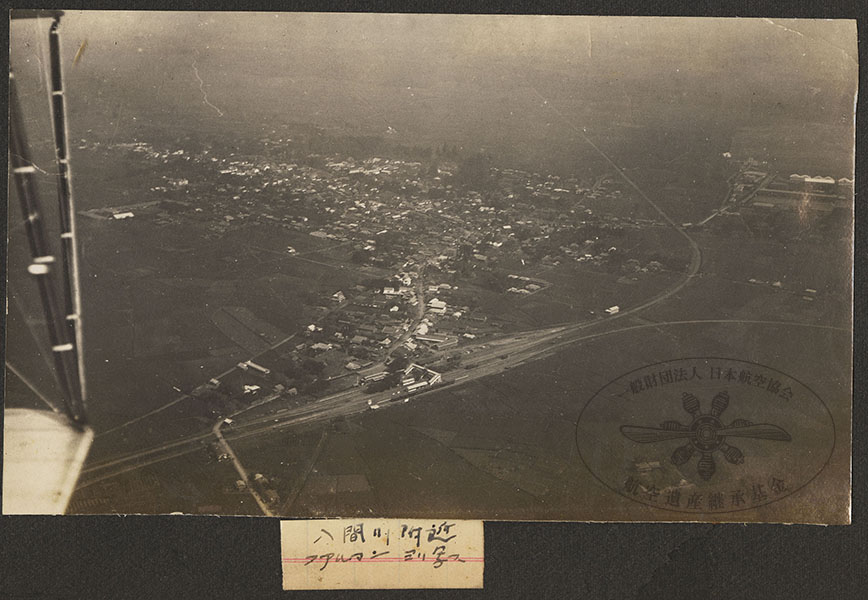 16/316枚目 画像ファイル名:SA-001_p.04-04.jpg 【オリジナルキャプション】 入間川付近 ファルマンヨリ写ス (航空協会注:「入間川付近」とあるが、入間川は写っていない) 埼玉 所沢の上空より。撮影年未詳 中央下に見えるのが所沢駅で、右上に所沢飛行場の格納庫が写っている。 |