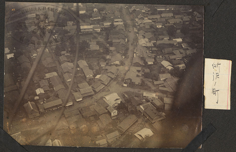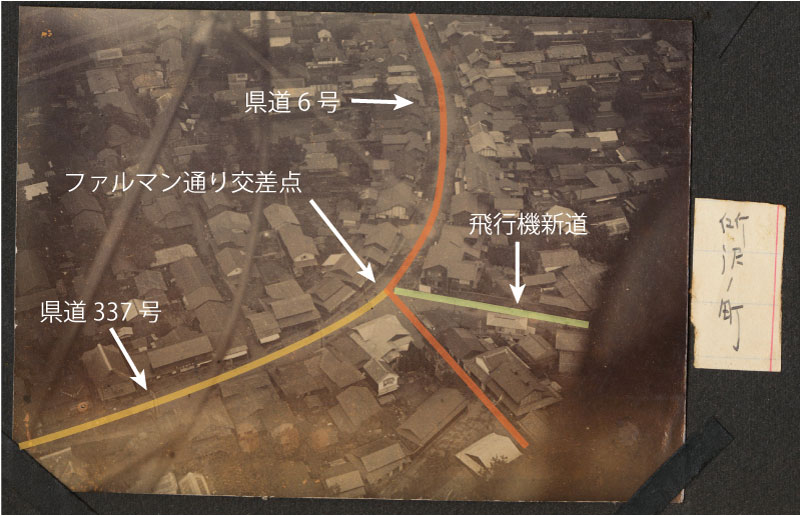 27/316枚目 画像ファイル名:SA-001_p.06-05.jpg 【オリジナルキャプション】 所沢ノ町 埼玉 所沢を空撮したもの。撮影年未詳。 現在のファルマン通り交差点辺りと思われる(下の写真参照)。写真左に機首の昇降舵の支柱の形状から判断して、陸軍モ式1912年型(モーリス・ファルマン1912年型)もしくはモ式1913年型(モーリス・ファルマン1913年型)からの撮影と考えられる。 |
