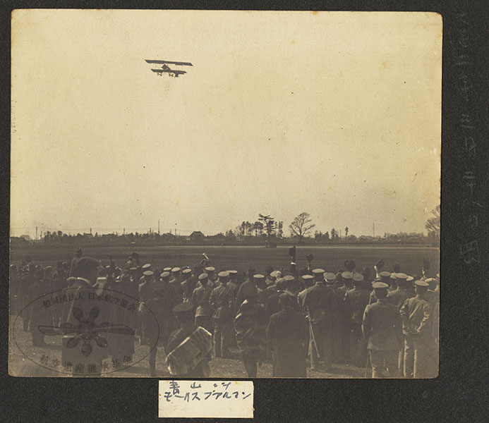 72/316枚目 画像ファイル名:SA-001_p.16-02.jpg 【オリジナルキャプション】 (右)大正二年三月二十八日 メモ:青山ニテモーリスファルマン (航空協会注:垂直尾翼が1枚なので、機体名は正しくは会式二号機もしくは三号機) 日本陸軍の会式二号または三号機。1913(大正2)年3月28日、東京 青山練兵場。 この日、会式(二号、三号機)、ブレリオ11-2bis、パルセバル飛行船を持って所沢から青山練兵場において野外公開飛行が行われた。その際、ブレリオ機が墜落事故を起こし第一期飛行機操縦将校の木村・徳田両中尉は日本初めての航空殉職者となる。 参考 日本航空協会,1956,『日本航空史 明治・大正編』航空遺産継承基金アーカイブ:p.77 |