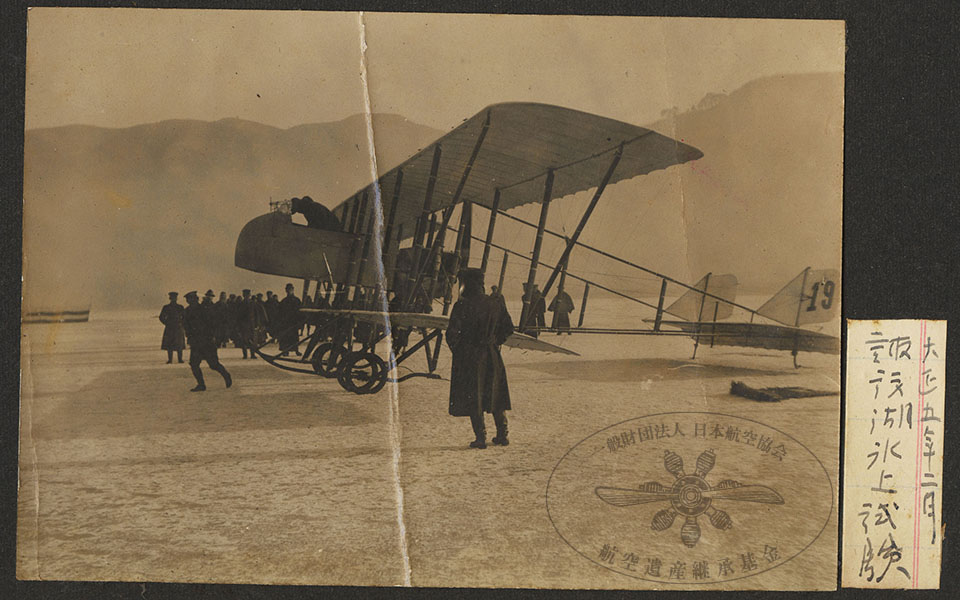 80/316枚目 画像ファイル名:SA-001_p.17-05.jpg 【オリジナルキャプション】 大正五年二月 諏訪湖氷上試験 (航空協会注:年代の誤り。正しくは1917(大正6)年) 日本陸軍のモ式1914年型(モーリス・ファルマン1914年型)19号機。1917(大正6)年2月、長野県の諏訪湖で撮影。 航空大隊の山地飛行演習の機会を利用し行われた甲府間山岳飛行及び諏訪湖で氷上着陸実験の様子。 参考 日本航空協会,1956,『日本航空史 明治・大正編』航空遺産継承基金アーカイブ:p.291 |