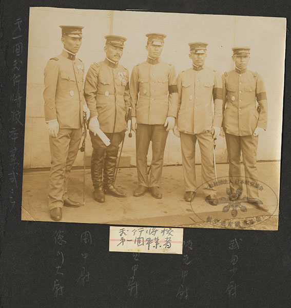 88/316枚目 画像ファイル名:SA-001_p.19-03.jpg 【オリジナルキャプション】 (左)第一回飛行将校卒業式ニテ (下縦書き)徳川大尉 岡中尉 沢田中尉 阪元中尉 武田少尉 メモ:飛行将校第一回卒業者 (航空協会注:公文書では「阪元」ではなく「坂元」と表記されている。) 左から、徳川好敏、岡楢之助、沢田秀、坂元守吉、武田次郎。1913(大正2)年6月30日、撮影地未詳。 右胸の下に飛行術を習得した軍人に送られる徽章が見られる。 同じく第1期操縦将校養成として教育を受けていた木村・徳田両中尉は卒業間際の1913(大正2)年3月28日に墜落により殉職している。 参考 『陸軍飛行機操縦術修得徽章附興規則制定の件』JACAR(アジア歴史資料センター)Ref.C02030684700、永存書類甲輯第1.2類 大正3年(防衛省防衛研究所) 「陸軍歩兵中尉坂元守吉叙勲ノ件」JACAR(アジア歴史資料センター)Ref.A10112849100、叙勲裁可書・大正七年・叙勲巻一・内国人一(国立公文書館) |