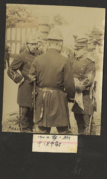 89/316枚目 画像ファイル名:SA-001_p.19-04.jpg 【オリジナルキャプション】 メモ:御大葬ノ折 中沢中尉 (下縦書)長沢中尉 右の人物は長沢賢二郎。1912(大正元)年9月13日~15日、青山練兵場。 背景から、明治天皇の大葬の式場となった東京の青山練兵場の入口で撮影されたと考えらる(文献1を参照)。青山練兵場での斂葬の儀は、9月13日から15日まで行われた(文献2)。 参考文献 1)帝国軍人教育会,1912,『御大葬写真帖』,大成会出版部(国立国会図書館デジタルコレクション:26〜59コマ):https://dl.ndl.go.jp/pid/1906695 2)大日本国民教育会,1912,『明治天皇御大葬誌』,大日本国民教育会.国立国会図書館デジタルコレクション https://dl.ndl.go.jp/pid/980700 :p.99 |