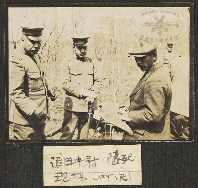 112/316枚目 画像ファイル名:SA-001_p.22-08.jpg 【オリジナルキャプション】 沢田中尉ノ墜死現場(所沢) 1917(大正6)年3月8日頃、埼玉 所沢。1917(大正6)年3月8日頃、埼玉 所沢。沢田秀が設計し、操縦していた会式七号小型飛行機の墜落した状況について説明を受けている様子。 |