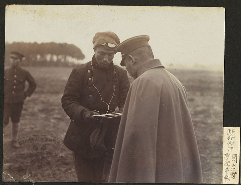 153/316枚目 画像ファイル名:SA-001_p.27-02.jpg 【オリジナルキャプション】 野外飛行 岡大尉 加藤中尉 (航空協会注:中央の人物は川上親孝) 川上親孝(中央)と岡楢之助(右)。撮影地、年未詳 |