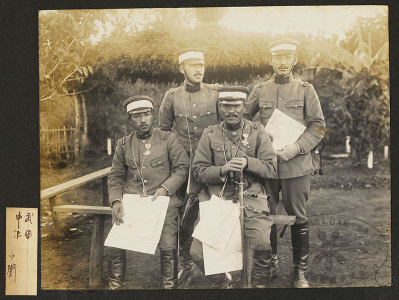 173/316枚目 画像ファイル名:SA-001_p.30-01.jpg 【オリジナルキャプション】 中沢 武田 小関 撮影地、年未詳。 人物名はオリジナルキャプションを参考にすると、中沢は中澤治平、小関は小関観三(おぜきかんぞう)と推定できる。同時期の飛行将校を探したところ、武田は数名いるが、いずれも写真とは別人。また4名とも肩章から尉官であることが分かる。 |