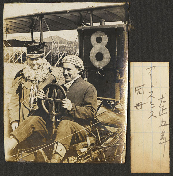 195/316枚目 画像ファイル名:SA-001_p.33-06.jpg 【オリジナルキャプション】 大正五年 アートスミス 同母 (航空協会注:スミスが母ととともに再来日したのは1917(大正6)年なので、「大正5年」は間違い アート・スミス(Art Smith)のカーチス複葉機とアートスミスの母(左)。1917(大正6)年、撮影地不明。 1916(大正5)年に1度目の来日、一度帰国後し1917(大正6)年に2度目の来日。 参考 日本航空協会,1956,『日本航空史 明治・大正編』航空遺産継承基金アーカイブ:p.304 |