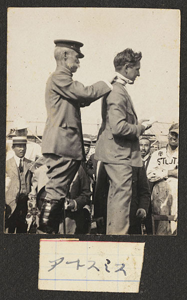 201/316枚目 画像ファイル名:SA-001_p.34-04.jpg 【オリジナルキャプション】 アートスミス 左から長岡外史、アート・スミス(Art Smith)。1916(大正5)年6月4日、東京 青山。 国民飛行会より贈呈の名誉賞授賞式を行った際、国民飛行会 会長 長岡外史中将よりメダルをかけられている様子 参考 国民飛行会編輯部,1916,『飛行機の持ち来りたる日米の親善』.国立国会図書館デジタルコレクション https://dl.ndl.go.jp/pid/942696 :p.8 |