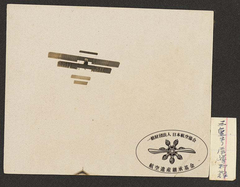 202/316枚目 画像ファイル名:SA-001_p.34-05.jpg 【オリジナルキャプション】 三重号尾崎行輝 帝国飛行協会のモーリス・ファルマン1913年型「三重号」。撮影地、年不明。 主翼に「MIE」と書かれている。この機体は、1915年に帝国飛行協会の三重支部の寄付金を受け「三重号」と名付けられ、磯部鈇吉が所沢で組み立てたものである。尾崎行輝が京城で開催中の朝鮮物産共進会から依頼され、10月1日から17日にかけて「三重号」を操縦して会場上空からビラを撒布した。そしてその帰りがけの10月27日に、三重県の久居練兵場で飛行会を催してた。 参考 日本航空協会,1956,『日本航空史 明治・大正編』航空遺産継承基金アーカイブ:p.220(pdf293コマ目) |
