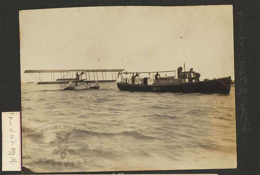 207/316枚目 画像ファイル名:SA-001_p.36-02.jpg 【オリジナルキャプション】 メモ:フアールマン 追浜 (右)カーチス品川沖着水 日本海軍のモーリス・ファルマン1914年型水上機。追浜、撮影年未詳。海軍がフランスから輸入した機体。当時の名称はモ式大型水上機であった。主翼で遮られていて全体は見えないが、尾翼に「七」と書かれている |