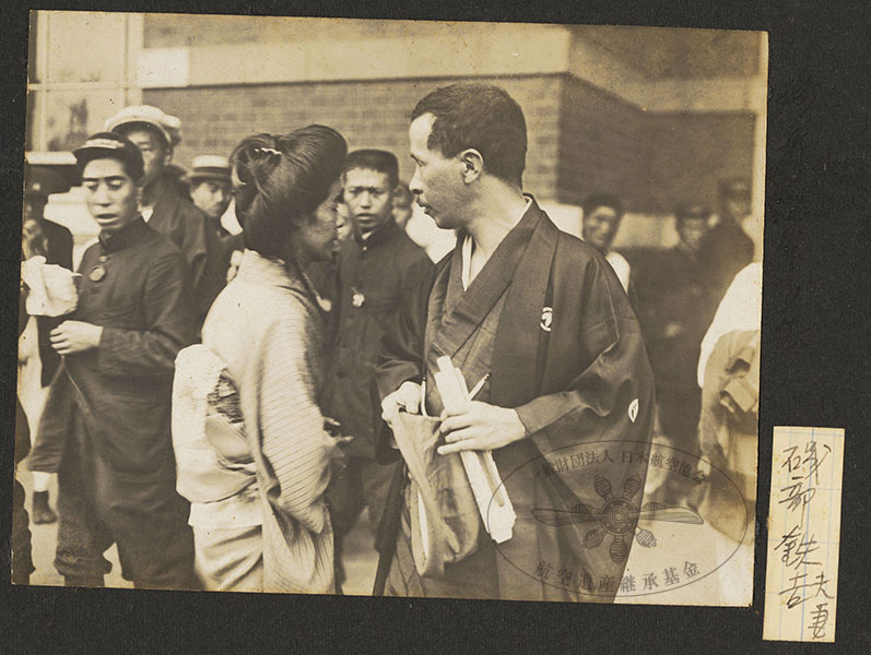 262/316枚目 画像ファイル名:SA-001_p.45-04.jpg 【オリジナルキャプション】 磯部鈇吉夫妻 磯部鈇吉(いそべおのきち)と妻のよつ子。1917(大正6)年9月14日、東京駅。 磯部鈇吉は、大日本帝国海軍の機関少佐だった時に航空に関心を持ち、海軍を退役して民間人として航空機の研究と普及に尽力した。磯部が1912年に創立に携わった「日本航空協会」は1913(大正2)年の財団法人帝国飛行協会(当協会の前身)に創立につながり、磯部は帝国飛行協会の技師として勤務した。磯部は1915(大正4)年に同協会を退職して第一次世界大戦中のフランスに渡り、陸軍航空隊パイロットとして志願従軍したが、1917(大正6)年に前線で負傷してフランス軍を退役した。写真は、フランスから帰国して東京駅で取材を受けた時の様子。その後もグライダー研究・開発などを行い、1930(昭和5)年には日本で最初の滑空団体である「日本グライダー倶楽部」を設立している。 参考 日本航空協会,1956,『日本航空史 明治・大正編』航空遺産継承基金アーカイブ:p.32 平木国夫,1980,『日本ヒコーキ物語』北陸信越篇,冬樹社.国立国会図書館デジタルコレクション https://dl.ndl.go.jp/pid/12064053 (参照 2025-04-28):p.29-32 |