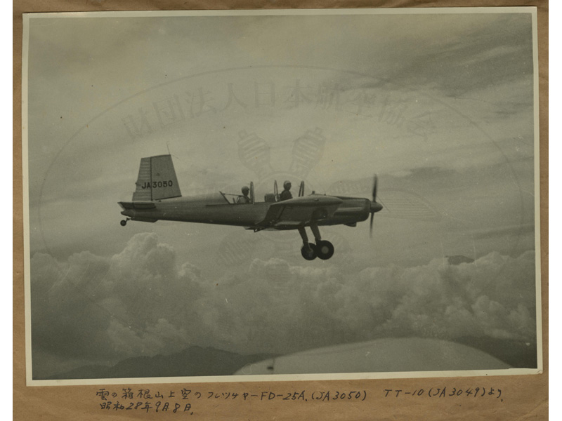 1/98枚目 「雲の箱根山上空のフレッチャー FD−25A(JA3050) TT−10(JA3049)より、昭和28年9月8日。」 東洋航空フレッチャーFD−25A(登録記号:JA3050)。 1953年9月8日(火)、箱根山上空 画像ファイル名:07−023−001−003−01.jpg |