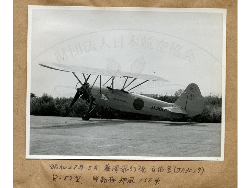 3/98枚目 「昭和28年5月 藤澤飛行場 立飛号(JA3017) R−52型 発動機神風 150HP」 立飛R−52「立飛号」(登録記号:JA3017)。1953年5月、藤沢飛行場 画像ファイル名:07−023−001−004−02.jpg |