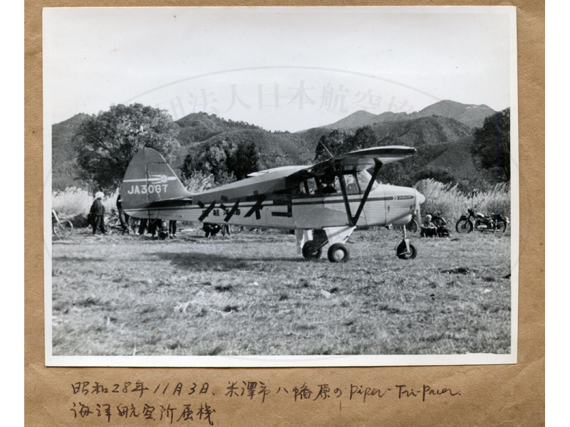 7/98枚目 「昭和28年11月3日 米澤市八幡原のPiper−Tri−Pacer 海洋航空所属機」 パイパーPA−22−135トリペーサー(登録記号:JA3067)。1953年11月3日(火)、米沢市八幡原 画像ファイル名:07−023−001−006−02.jpg |