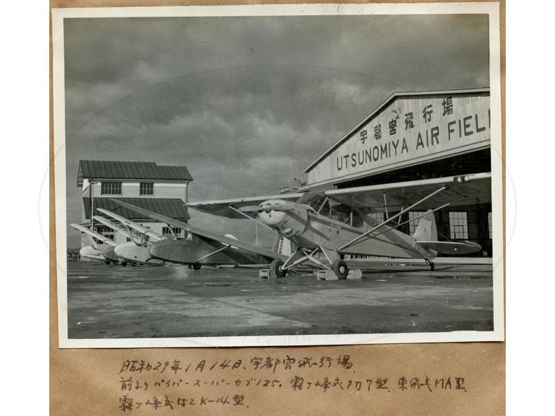 56/98枚目 「昭和29年1月14日。宇都宮飛行場。 前よりパイパースーパーカブ125.霧ヶ峰式タカ7型.東飛式MA型.霧ヶ峰式はとK−14型.」 右からパイパーPA−18−125スーパーカブ「小鳩」号(登録記号:JA3008)、霧ヶ峰鷹7(登録記号:JA2009)、東飛MA(登録記号:JA0054)、霧ヶ峰はとK−14(登録記号:JA0066)、萩原H−22(登録記号:JA0075)。1954年1月14日(木)、宇都宮飛行場 画像ファイル名:07−023−001−031−01.jpg |