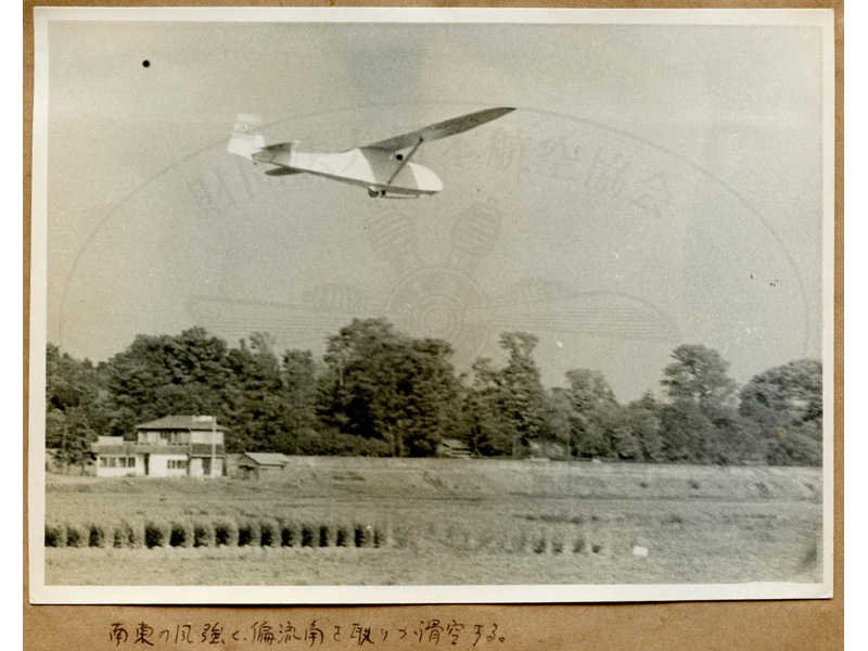80/98枚目 「南東の風強く偏流角を取りつつ滑空する。」 霧ヶ峰鷹7(登録記号:JA2001)。1954年5月1日(土)、玉川飛行場 画像ファイル名:07−023−001−043−02.jpg |