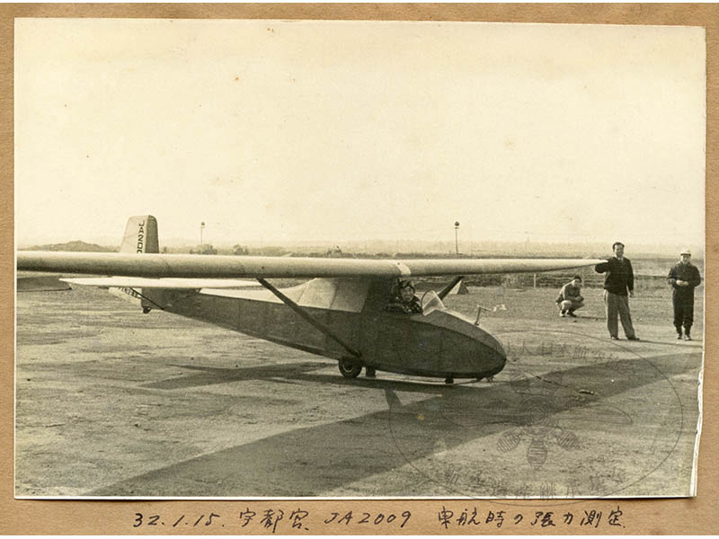 116/117枚目 「32.1.15. 宇都宮 JA2009 曳航時の張力測定」 日本学生航空連盟の霧ヶ峰鷹七(登録記号:JA2009)。1957年1月15日(火)、宇都宮 画像ファイル名:07−023−009−061−01.jpg |